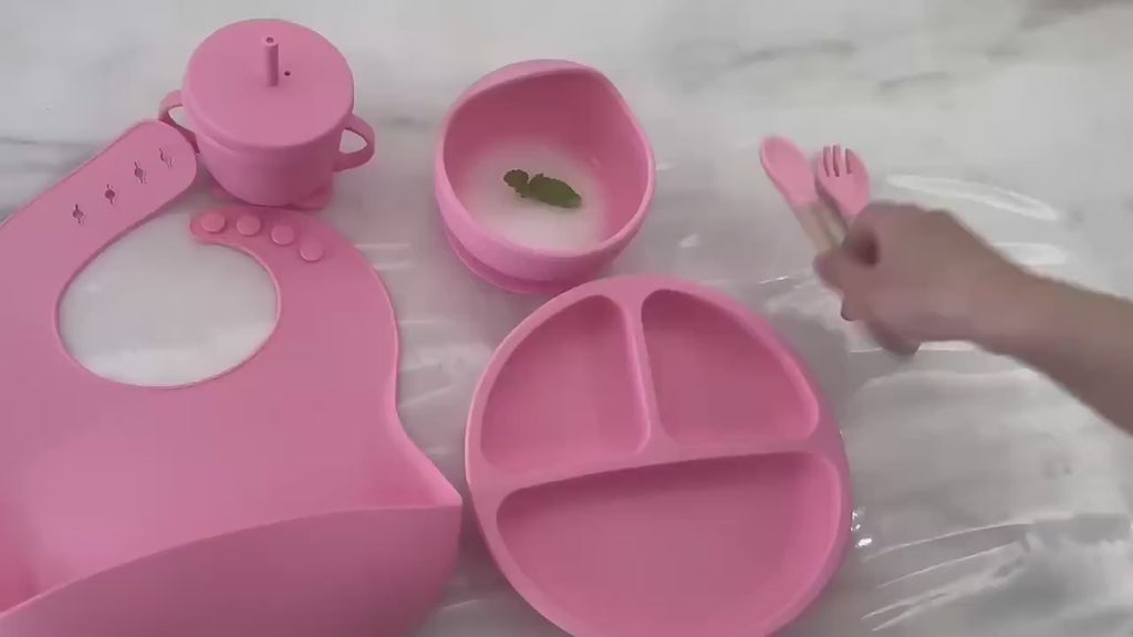 ✔ 7-Piece Feeding Set (image + label): Includes a silicone bib, sectioned plate, bowl, sippy cup, and multiple spoons/forks – ideal for full meal use.